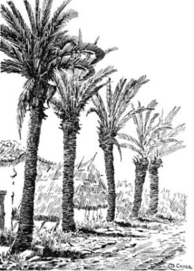 ¡Palmeras canarias! Puede decirse que no había un palmo de tierra en las islas que no contara con uno de estos emblemas de paz, airón señero, guías y jalones del caminante... De ahí que se prodigara tanto su nombre en nuestro suelo. Valle del Palmar, El Palmito, Palmitales, Río de las Palmas… Abundan en todas las latitudes. En las altas colinas y en los hondos barrancos; en el regazo de los valles y a las orillas del mar. Solas, en parejas o en grupos. Algunas ocultas en las umbrías de los bosques, otras al lado de corpulentos dragos, como una bella silueta femenina junto a la recia masculinidad de nuestros árboles milenarios. Castas doncellas seducidas por los hércules de nuestra flora, que parecen acercarse a éstos con temor…